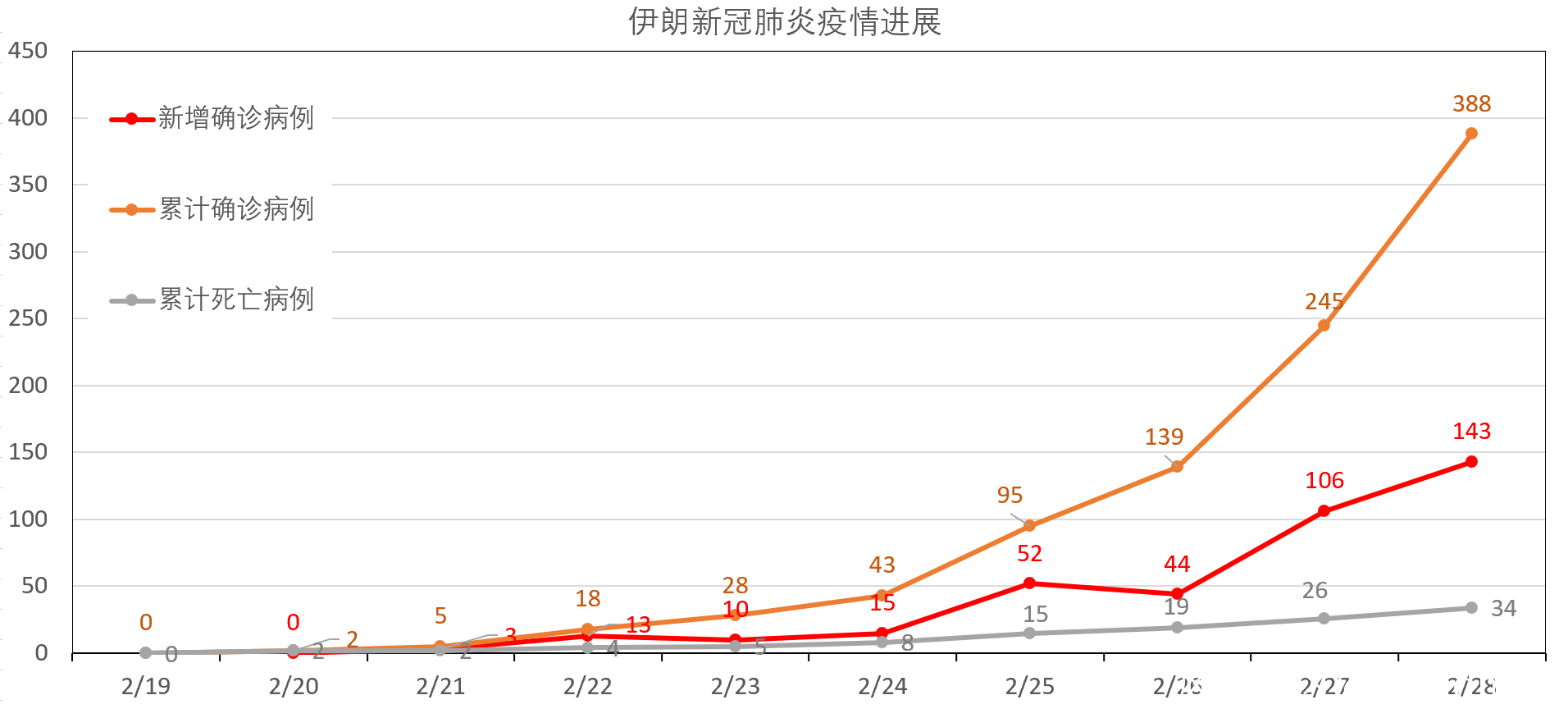 第四名伊朗:截止27日,新增確診病例再創新高,達到了143例,累計388例;新增死亡病例8例,累計34例,病亡率高達8.8%,為全球最高。伊朗的多位高官,如副總統、衞生部副部長、議會國家安全委員會主席均傳出感染新冠肺炎的消息,前駐梵蒂岡大使已經因病去世,由此可見伊朗疫情處於大流行階段。中國政府已經緊急向當地援助了核酸檢測試劑盒,以解燃眉之急。