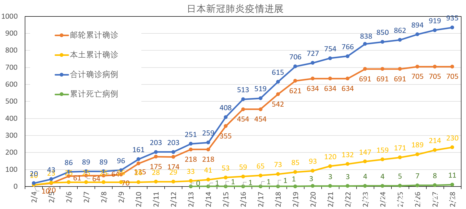 第二名日本:鑽石公主號郵輪沒有變化,船上最後150名船員也將於今明兩天撤離,累計確診705例;本土新增確診病例16例,累計230例。兩者合計確診935例;病亡增加3例,累計11例,病亡率為1.2%。日本數據失真令人髮指,今天增加的16例全部來自地廣人稀的北海道,只是因為那位倔頭倔腦的道知事鈴木直道堅持檢測所有的疑似病例。日本政府如此諱疾忌醫,只怕離夢想中的東京奧運會越來越遠。