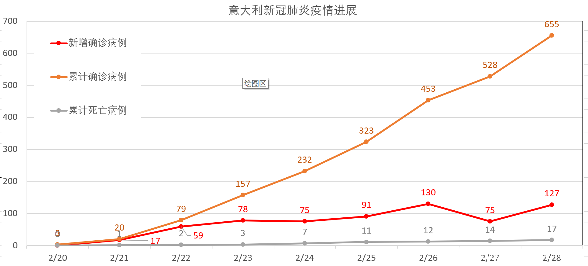 第三名意大利:疫情繼續發展, 截止當地時間28日12點,又新增127例,累計確診655例;病亡增加3例,累計17例,病亡率高達2.6%。由於意大利是申根協定國家,相關的疫情迅速向周邊國家擴散:德國新增病例35例,法國新增病例23例,西班牙新增病例12例,瑞士新增病例11例,克羅地亞、挪威、奧地利、瑞典等多國均出現新發病例,歐洲的抗疫形勢迅速惡化。