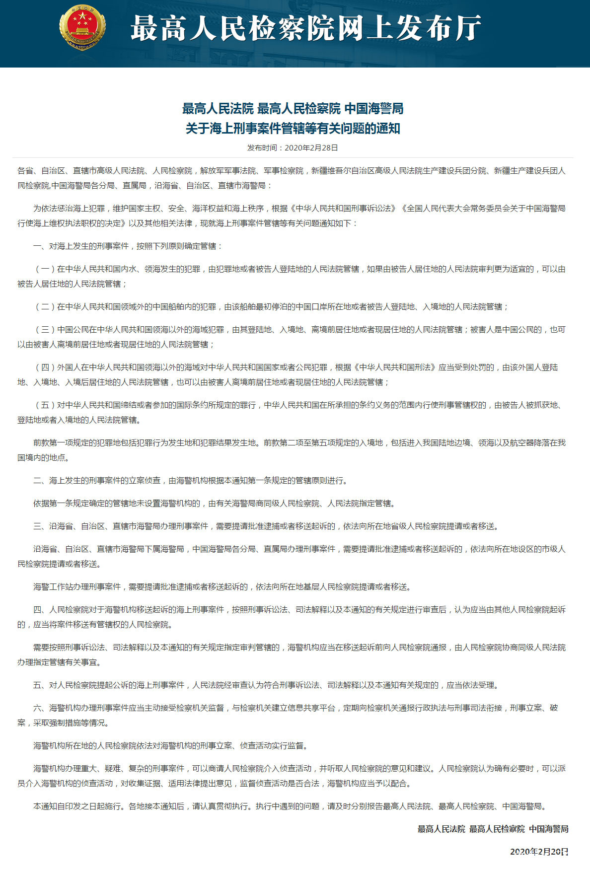 兩高與中國海警局發佈關於海上刑事案件管轄等有關問題的通知來源:最高人民檢察院網站