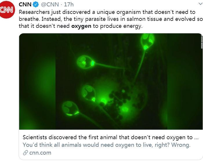 據報道,科學家發現一種寄生鮭魚細胞組織的特殊生物體Henneguya salminicola,“竊取現成養分,而非直接吸收氧去製造能量”。