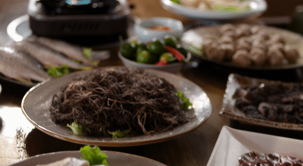 最主要的素菜是本地的海菜和石葱,海菜是糟粕醋火鍋的老搭檔,含有大量的凝膠狀物,藻體通透。