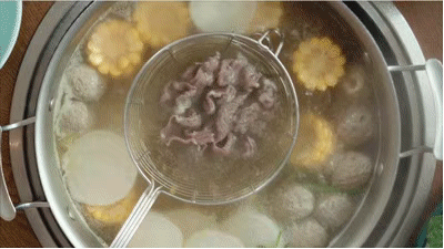 新鮮牛肉放在撈勺上在滾燙的湯底裏搖散,三起三落,就能吃到牛肉別具一格的原汁原味。