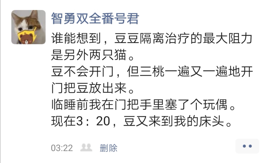 我放心地去睡了,凌晨三點,我被貓貓踩醒,一摸,是豆。