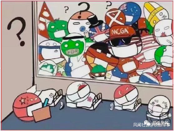 接着,中國開始下地(疫情漸輕),然後拿着小本本突然寫了起來,而且面有不悦。窗外的圍觀者很好奇,都伸長了脖子想知道中國在寫什麼。