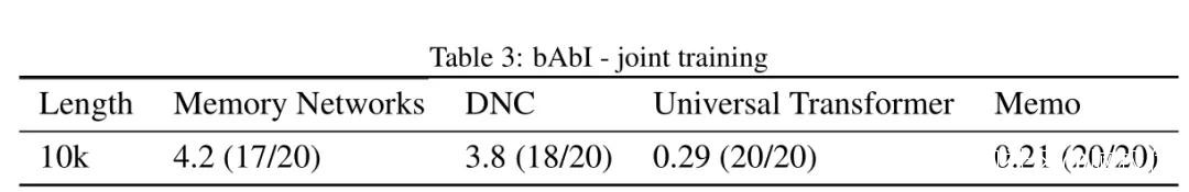 3、關於BABI任務的問答測試上:在10k訓練集中,將 MEMO 與兩個基準模型以及UT模型進行了比較,結果顯示,MEMO唯一能夠在較長的序列上成功回答最複雜的推理查詢的體系結構。