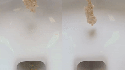 就像下圖中,一坨黏糊糊的物體在滴落到馬桶上後,直接滑落,動作流暢,無殘留,對馬桶一點眷戀都沒有: