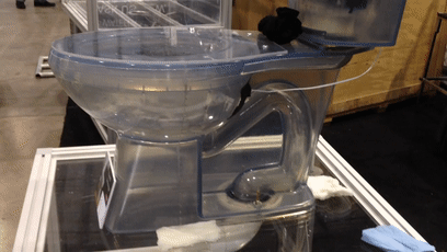 圖中這個馬桶出現於加利福尼亞州的一個展覽會上,整體採用透明材料,水箱裏的水清晰可見: