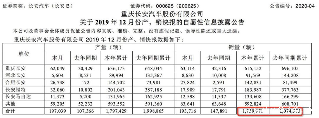 在2019年業績預報中,長安汽車將業績下滑原因,歸咎於銷量的下滑。據長安汽車披露的產銷數據,2019年其共計售出176萬輛車,同比下滑15.16%。