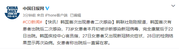 快訊!韓國首次出現患者二次感染來源:中國日報網