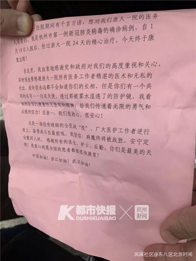 “或許我永遠都不會知道你們的長相,但是你們有一個共同的名字——白衣天使!”32歲的沈先生(化名)是杭州市第一例確診的新冠肺炎患者。經過浙大一院24天的精心救治,2月12日下午,沈先生終於痊癒出院。