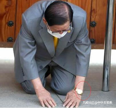 韓國新天地教會頭目李萬熙2日召開記者會,為教會出現大量感染者下跪道歉,祈求韓國民眾原諒。有眼尖的媒體發現,他手上竟戴着前總統朴槿惠的紀念手錶,立刻成為韓國媒體的報道焦點。