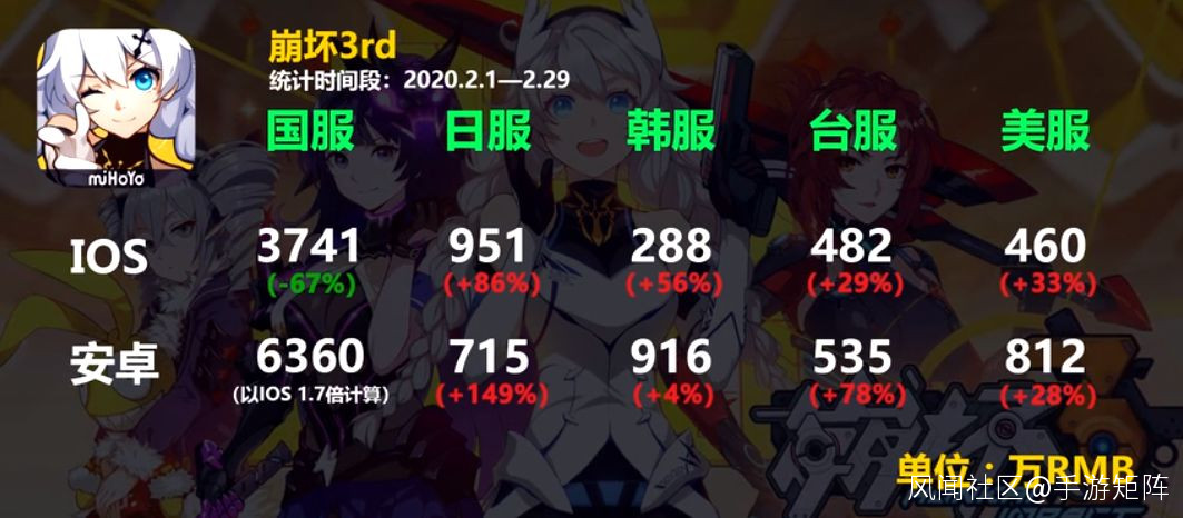 此外,像米哈遊的《崩壞3》、紫龍互娛的《風之大陸》、有愛互娛的《放置少女》等產品,則代表了出海二次元手遊玩法品類不同的嘗試方向,這些產品也分別在不同地域或者受眾人羣中獲得了成功。特別是《崩壞3》在日韓市場的2月更新以及營收活動,受到當地玩家的追捧據(App Annie數據顯示:日韓市場雙平台用户會話次數環比提高30~40%),也助力米哈遊成功重回廠商收入榜。