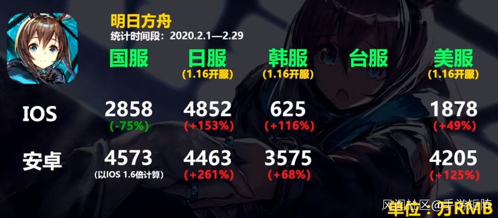 《明日方舟》在2月的主要收入海外市場依然是日本、韓國和美國,分別佔比46.8%,21.7%和17.9%;其海外總收入是中國iOS的6.7倍。截至2月29日,該遊戲在日本的RPD(每下載付費)為26美元。
