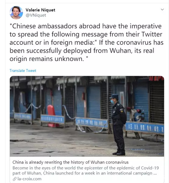 這個學者名叫瓦萊麗•尼凱(Valérie Niquet),是法國戰略研究基金會亞洲部負責人。這個去年曾因誹謗中國華為公司是中國政府擁有的國企,而被華為公司起訴的反華學者,在此次疫情期間也沒閒着,一直在發表着各種妖魔化中國的言論。