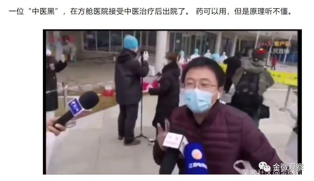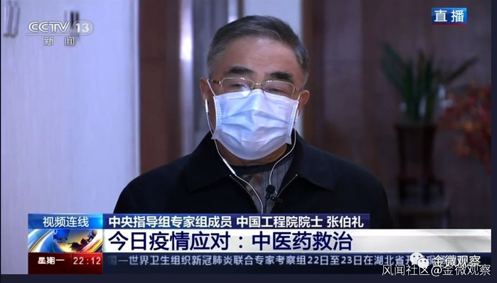 張伯禮的短短十幾分鐘的採訪,清澄了幾個關鍵問題,比如中藥只是安慰劑的説法,張伯禮説,中醫治療輕症患者是有效果的,評價的兩個重要標準病人痊癒的時間和是否會轉向重症,這在江夏方艙醫院無一例轉成重症。