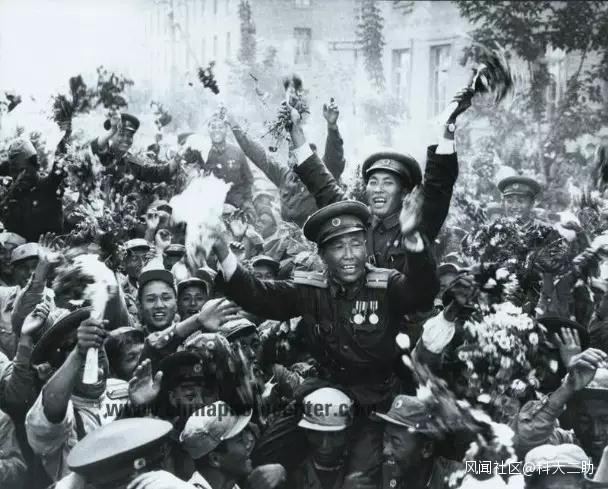 上圖是1953年3月,一名被釋放的無腿志願軍戰俘走向祖國懷抱。看臉上毀容的傷疤,似乎是經受過美軍凝固汽油彈的攻擊。