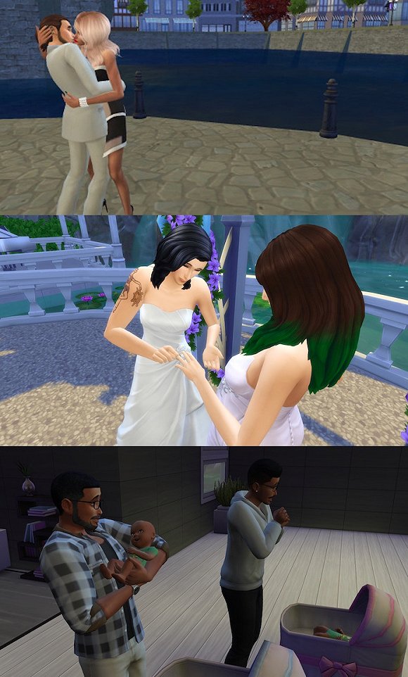 上文已經講到粉絲在玩《模擬人生》時的自我代入與情感傾向,《模擬人生》中的浪漫言情是遊戲的重點之一,據EA官方統計,《模擬人生》的20年間一共產生了16億個模擬市民,發生過13億次“嘿咻”(woohoo)。人物之間從約會初吻到求婚訂婚乃至“嘿咻”都是遊戲最有儀式感的瞬間,在那些時刻,玫瑰花會落下、煙花會綻放、音樂會奏起。也有粉絲將1代到4代不同的小人在教堂、拱門、海邊、家裏等地方的婚禮儀式場景製作成了視頻,見證模擬世界浪漫關係20年的變革。