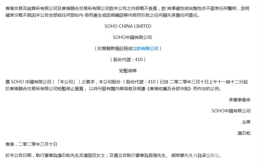 對此,SOHO中國方面稱會發布相關公告,一切以公告為準。
