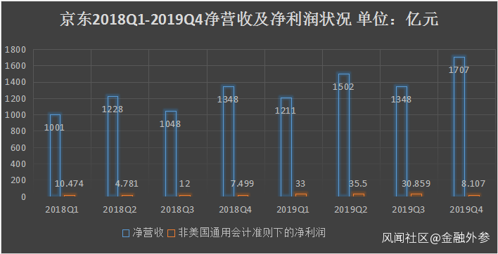 放在更長的時間階段來看,在美國非通用會計準則之下,京東從2018Q1至2019Q4,已經實現了連續八個季度的盈利,其財務表現不可謂不亮眼。但仔細查看,會發現賺錢是賺錢,但賺錢能力卻難以令人恭維。