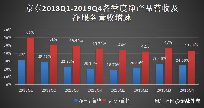 縱觀2018Q1至2019Q4這八個季度的京東各板塊營收增長情況來看,其淨產品營收(自營商品)的增速遠遠滯後於淨服務營收(第三方平台服務)的增速,並且在過往的八個季度,平台淨服務營收的增速基本上保持着接近甚至超過2倍於淨商品營收的增速,成為平台“增收”的重要引擎。