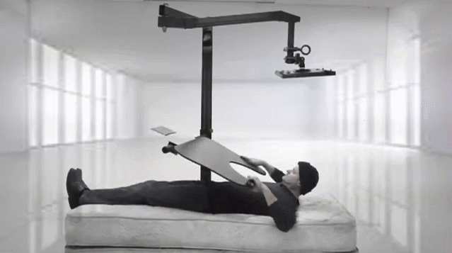 當然,時代在進步,技術也在進步。舉個例子,2017年ErgoQuest推出的這款產品已經足以滿足當代不少玩家關於躺着玩遊戲的幻想了。你可以放下小桌卡住自己,然後自由調整顯示器的距離和角度。