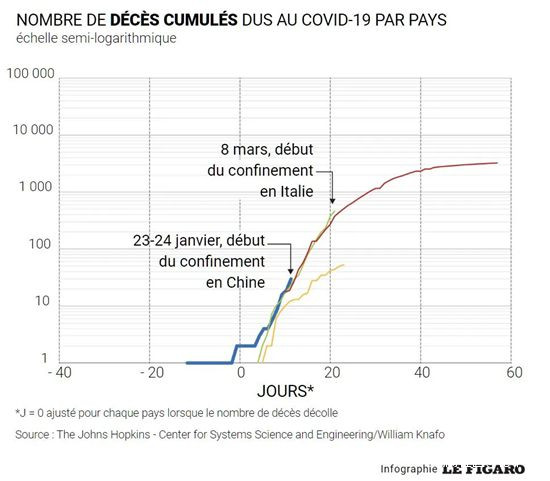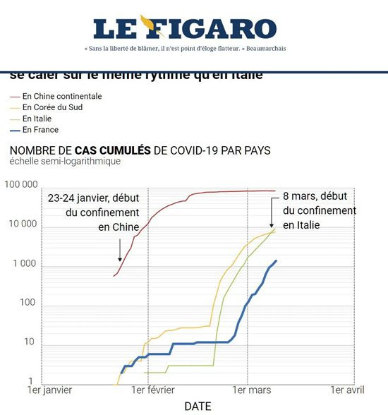 11日 ,法國《費加羅報》就製作了一張法國、意大利、韓國、中國的感染人數趨勢圖。
