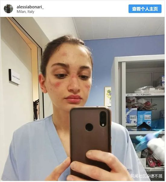 無獨有偶,意大利一名護士摘下防護面罩的照片也引發極大關注。