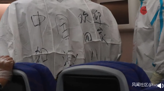 飛行中,廣播説“歡迎大家回到祖國,歡迎回家”。