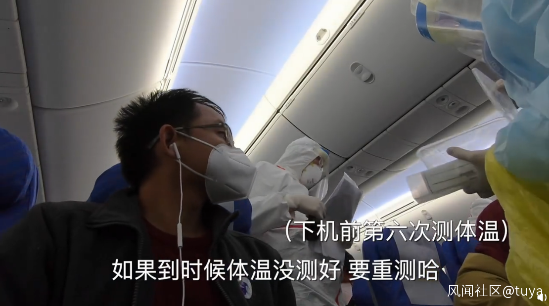 7個小時的飛行時間裏,工作人員們又對每位乘客進行了兩次體温檢測。