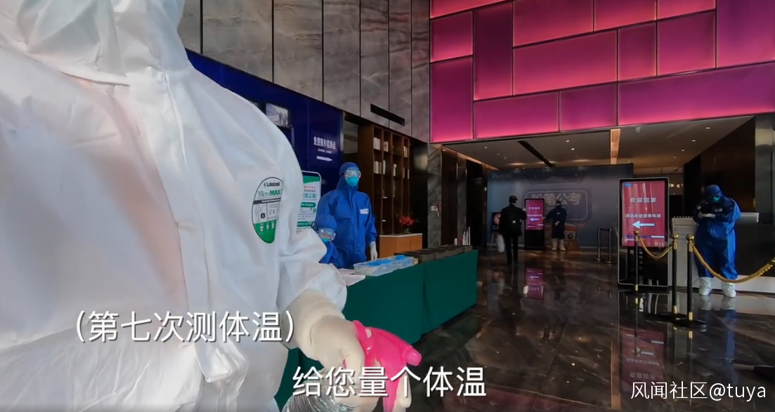 @龍微環遊記 在視頻中介紹道,隔離的酒店裏,牆面、地面都做好了防護措施,中央空調關閉,一日三餐都由工作人員送至門口的台子上,敲門後離開,由隔離者自取。