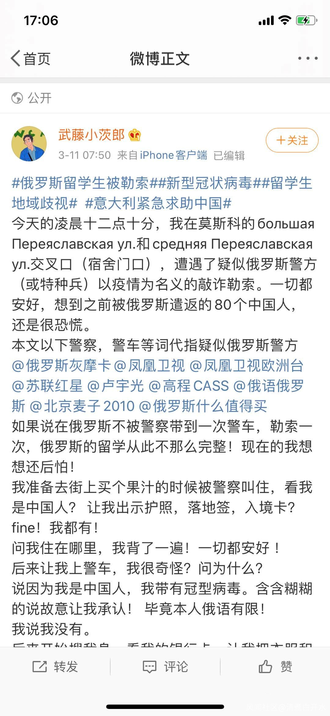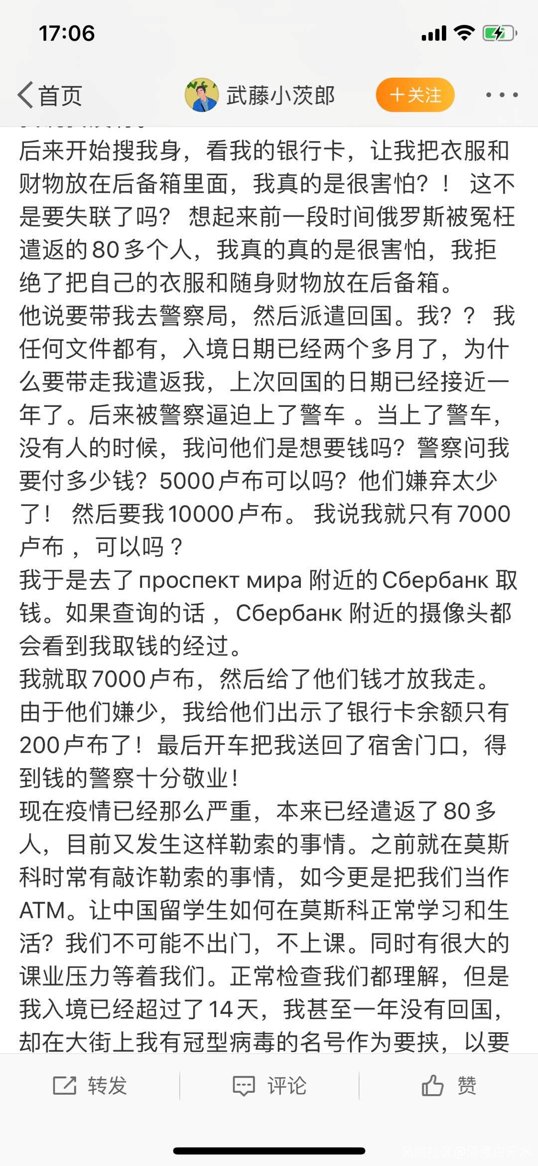 説實話,本不想對此事過多的評價的,畢竟非常時期!但有朋友非要問我,這是不是真的,那我只能説,我傾向於這位博友説的,他確實遭遇了莫斯科黑警敲詐。