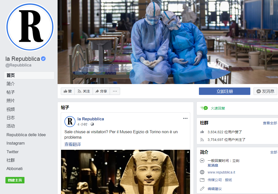 11日,意大利發行量最大的日報意大利共和國報(la Repubblica)將臉書的主頁封面換成了我國醫護人員的暖心照片,並配有一段白描的文字: