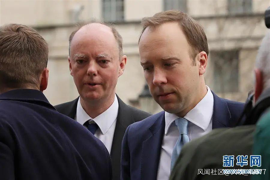 ▲3月9日,在英國倫敦,英國衞生大臣馬修·漢考克(右)和英格蘭首席醫療官克里斯·惠蒂準備參加內閣緊急安全會議。(新華社發 蒂姆·愛爾蘭 攝)