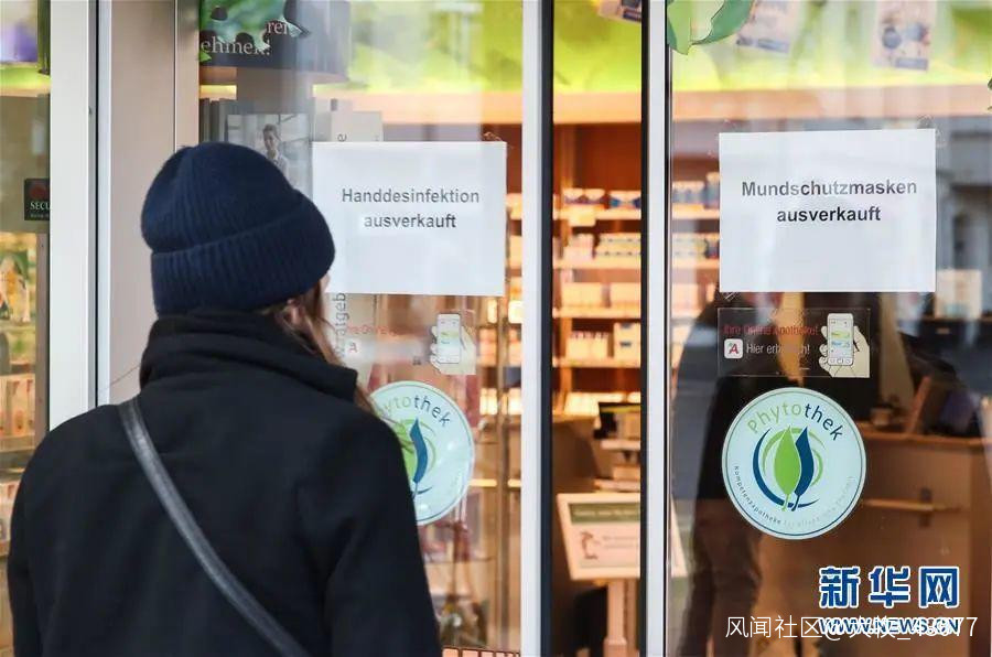 ▲3月9日,在德國首都柏林,一名顧客進入一家張貼着口罩和消毒洗手液售罄告示的藥店。(新華社記者 單宇琦 攝)