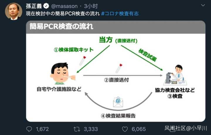然後今天傍晚左右,孫正義更新了自己的推特,正式發出了自己的提案。他要向日本民眾提供免費檢測新冠病毒的機會,先期向100萬人提供簡易PCR的檢測服務。