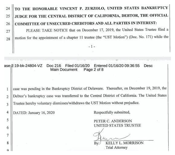 現任監管人在1月16日向法庭提交文件,由於案件已經從特拉華州移交加州,自願撤回 (voluntary dismiss/withdraw) 了前任監管人提交的關於指派破產重組監管人的動議。