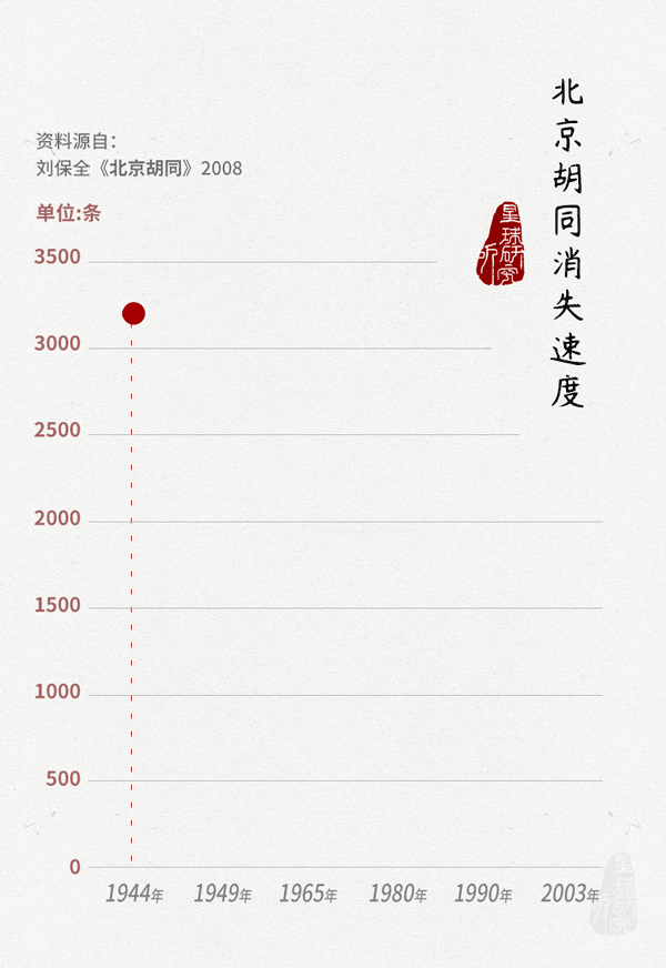 (下圖為北京胡同的消失速度,由於四合院消失速度過快,數量過多難以統計,而衚衕作為四合院聚集的街道,其消失過程能在一定程度上反應衚衕的消失過程,因而代之以衚衕的消失速度。製圖@張靖/星球研究所)