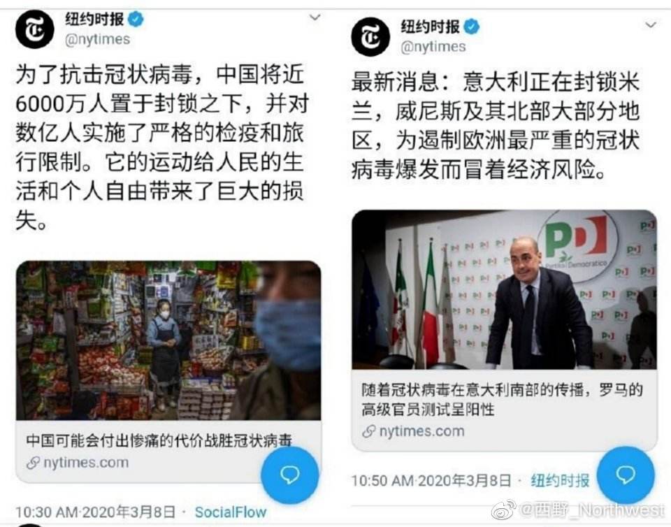近日,《紐約時報》連續發佈推文,點評中國封城“給人民的生活和自由帶來了巨大損失”,意大利封城則是“為遏制冠狀病毒肺炎,冒着經濟風險”。兩條信息發佈時間僅僅相隔20分鐘,卻充分展示了這家標榜“客觀公正”的媒體是如何“雙標”的。
