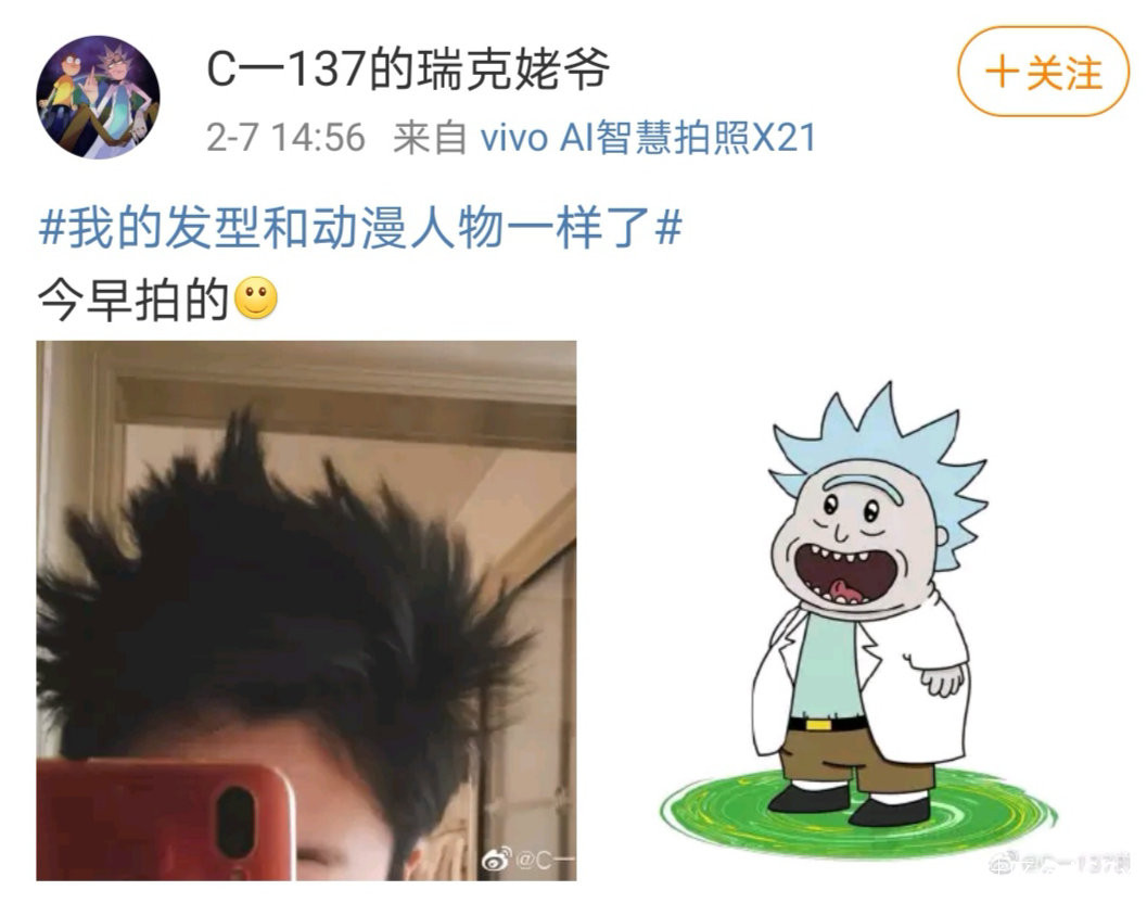 在微博“我的髮型和動漫人物一樣了”話題討論中,網友進行了一場“宅家髮型”大比拼。部分選手實力之強勁,已經可以做到不用髮膠、睡醒自動生成並保持二次元髮型的程度了。《寶可夢》裏武藏的那段“我們是穿梭在於銀河的火箭隊”的台詞彷彿迴盪在耳邊。