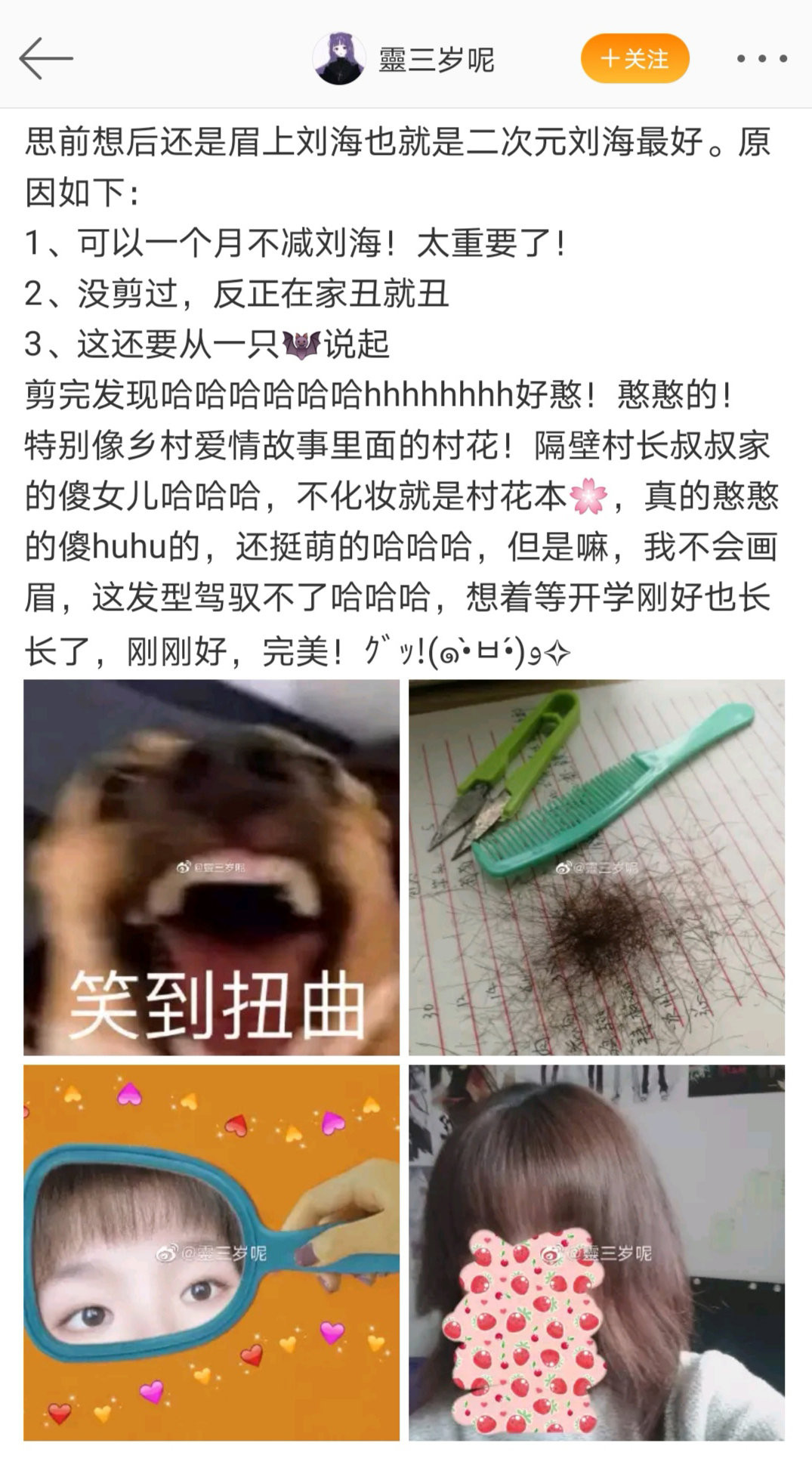 要是拿不準自己的剪髮技術,可以從小範圍的劉海開始練手。比如剪一個前段時間極為流行的《櫻桃小丸子》同款“二次元劉海”,看起來萌就完事了。即便手抖剪出缺口了,也可以當作“狗啃劉海”,依然能夠引領潮流。