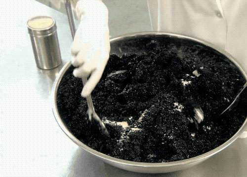 海帶本來長在海里,自帶大海的風味,顏色又是黑色的,既不用添加香料也不需要添加色素,果然就是做「人造魚子醬」的完美原料…工廠裏先把風乾的海帶磨成粉末(下面這個黑色的),再加入鹽、檸檬酸。有時候為了增加風味,也會添加其他一些風味物質…