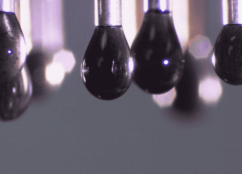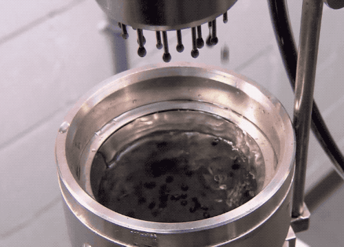 等這些小液滴掉入下方的凝固液後,就形成了一顆顆圓潤的小珍珠了…