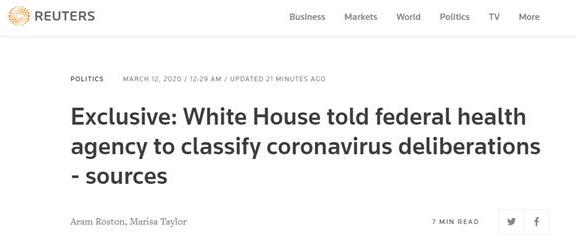 英國路透社12日援引4名特朗普政府官員透露稱,白宮曾下令要求聯邦衞生官員將最高級別的新冠病毒會議列為機密。路透社報道評論説,這一反常舉動限制了信息傳播,並妨礙了美國政府對病毒擴散的應對措施。