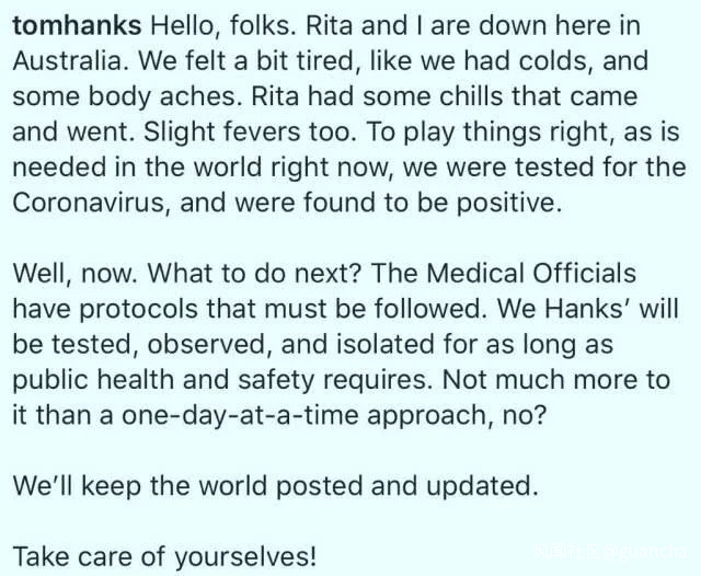 巧的是3月11日晚,世界衞生組織表示新冠肺炎疫情“已具有全球大流行特徵”。12日早晨湯姆·漢克斯夫婦就被確診,他們成為第一批確診新冠肺炎的好萊塢明星。
