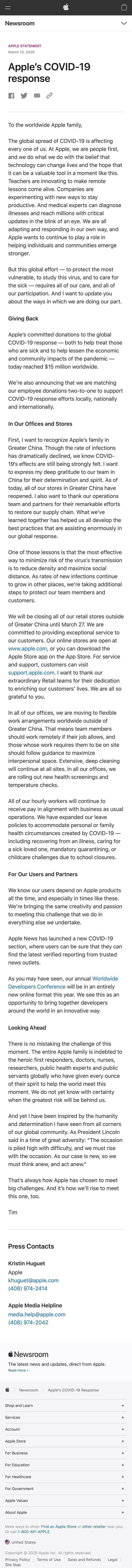 公告還稱,為了應對新型冠狀病毒的全球大流行,3 月 27 日之前,將關閉大中華區以外的所有零售店。
