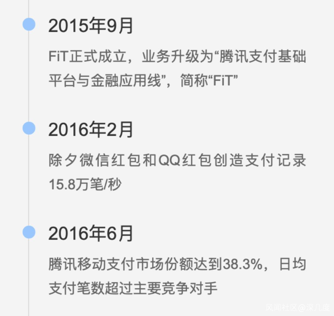 歷經春晚工程後,2015年9月,騰訊FiT成立,“連接人與金融”,整合微信支付和 QQ錢包兩大平台,連接用户、商户和金融機構,為14億人提供金融產品與服務成為了這個部門的任務。2016年以後,騰訊FIT技術逐漸為春節紅包構建了一套“多點多活、多地多中心”的分佈式交易系統。