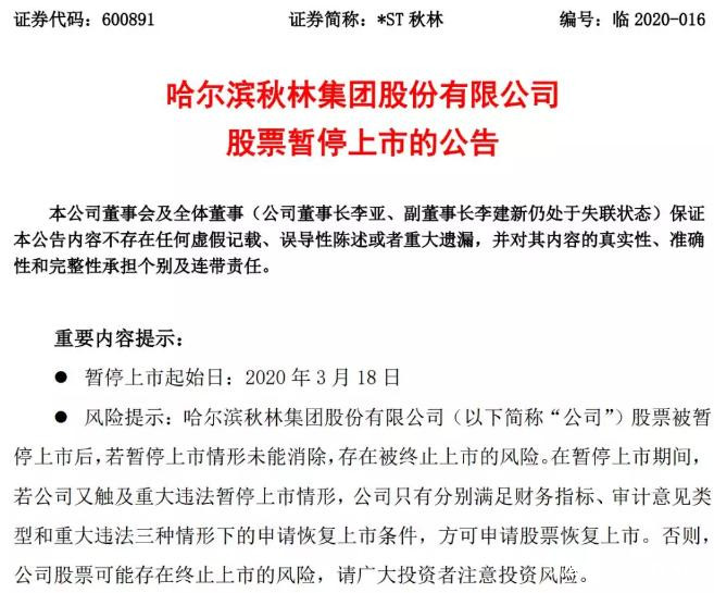 3月13日晚,*ST秋林(600891)公告將暫停上市。