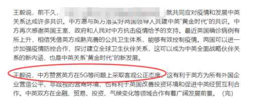 很多人都把國家關係看的太虛無,其實有些時候,和買菜也沒有區別~比如,某些新聞,你要連起來看。外交部9號回覆英國,前面先説了疫情,然後最後一段,畫風一轉,開始誇英國5G發展的好,採取了客觀公正的態度。