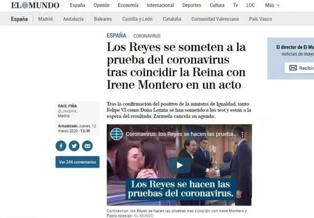 當地時間3月12日,西班牙社會平等部部長伊萊娜·蒙特羅確診感染新冠病毒。6日,蒙特羅曾與西班牙王后萊蒂齊亞一起出席活動。兩人有過身體接觸,蒙特羅還親吻了王后。在蒙特羅確診之後,西班牙國王及王后均接受新冠病毒檢測。